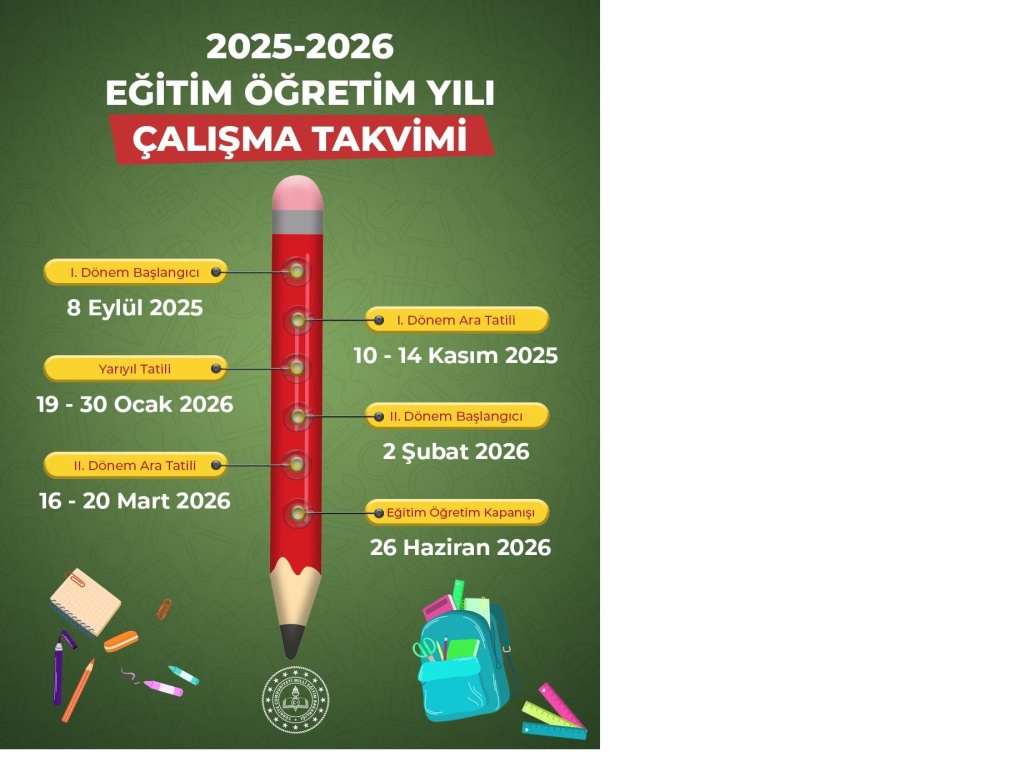 Millî Eğitim Bakanı Yusuf Tekin imzasıyla yayımlanan "2025-2026 Eğitim ve Öğretim Yılı Çalışma Takvimi" konulu genelge tüm illere gönderildi. Buna göre yeni eğitim öğretim yılında öğretmenlerin mesleki çalışmaları, 1 Eylül Pazartesi başlayacak. Okullarda birinci dönem, 8 Eylül Pazartesi başlayacak ve 16 Ocak 2026 Cuma günü sona erecek. 2025-2026 eğitim öğretim yılında okul öncesi eğitim ile ilkokul 1'inci sınıfa başlayacak öğrenciler için 1-5 Eylül tarihleri arsında uyum eğitimleri düzenlenecek. Ortaokul ve imam hatip ortaokullarının 5'inci sınıfları, ortaöğretim kurumlarının hazırlık ve 9'uncu sınıfları ile pansiyonda kalacak öğrencilerin okul hakkında bilgilendirilmesi, akademik ve mesleki gelişimlerinin desteklenmesi ve yeni eğitim ortamına kısa sürede uyum sağlamaları amacıyla rehberlik çalışmaları yapılacak. Birinci dönem ara tatili, 10-14 Kasım arasında yapılacak. Yarıyıl tatili de 19 Ocak 2026 Pazartesi başlayacak ve 30 Ocak 2026 Cuma günü sona erecek. İkinci dönem, 2 Şubat 2026 Pazartesi başlayacak ve 26 Haziran 2026 Cuma günü eğitim öğretim dönemi tamamlanacak. İkinci dönemin ara tatili ise 16 Mart 2026 tarihinde başlayıp 20 Mart 2026 Cuma sona erecek.